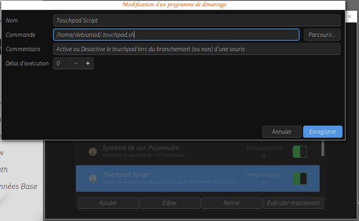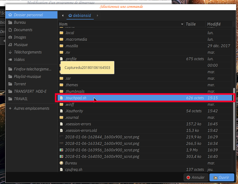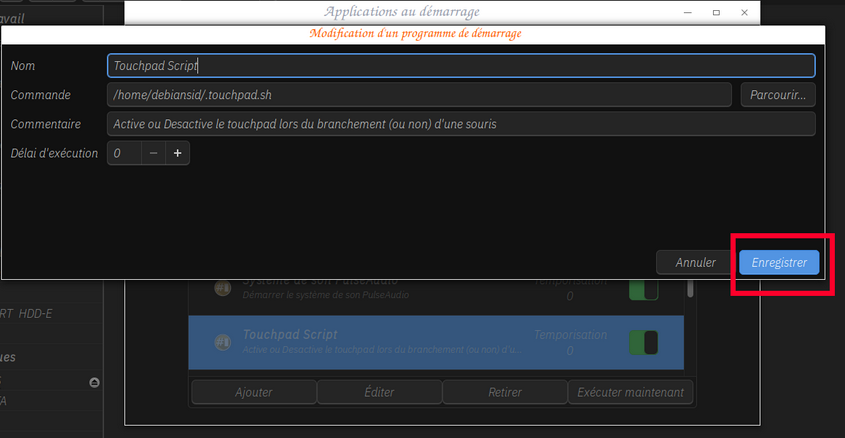 - et pour finir on double clique sur notre fichier ""touchpad.sh"" encadré rouge sur ma capture