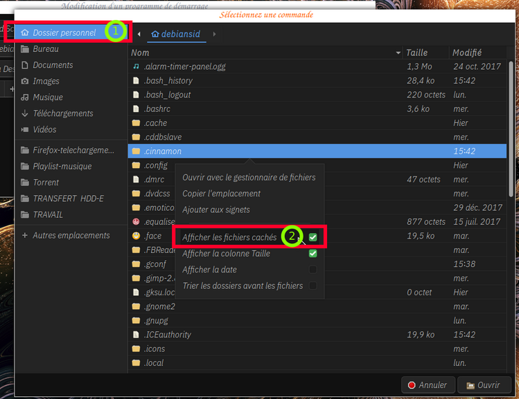 - ensuite on fait un clic droit et on choisit ""afficher les fichiers cachés"" chiffre 2 et encadré rouge sur ma capture d'écran