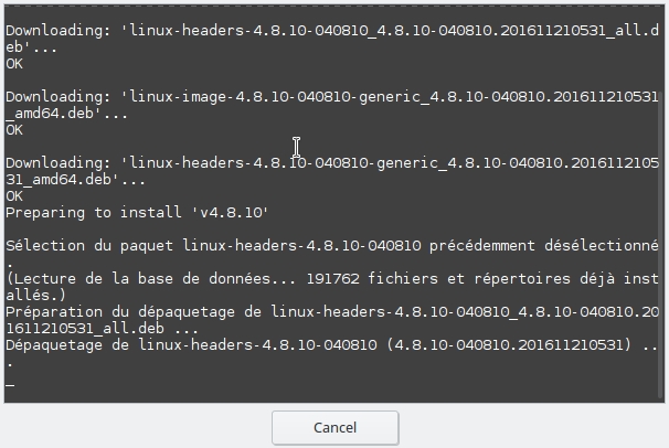 J'ai découvert Ukuu Update Utility, un petit logiciel qui installe le dernier noyau stable ou le dernier instable -rc (4.8.10 ou 4.9-rc6).