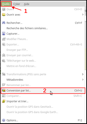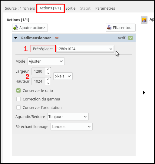 - Dans la fenêtre principale, (1)sélectionner la (ou les) images, (2) clic D puis choisir le format dans ceux proposés. La (ou les photos) photo reformatée est sauvegardée dans le dossier d'origine (c'est quasi instantané),