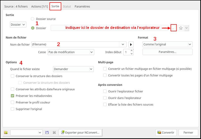 (4) Pour les options, je ne touche à rien, je ne détaille pas, il suffit de lire - -soit renvoyer dans les dossier source, dans ce cas il faut changer leur nom, sinon écrasement de l’original.