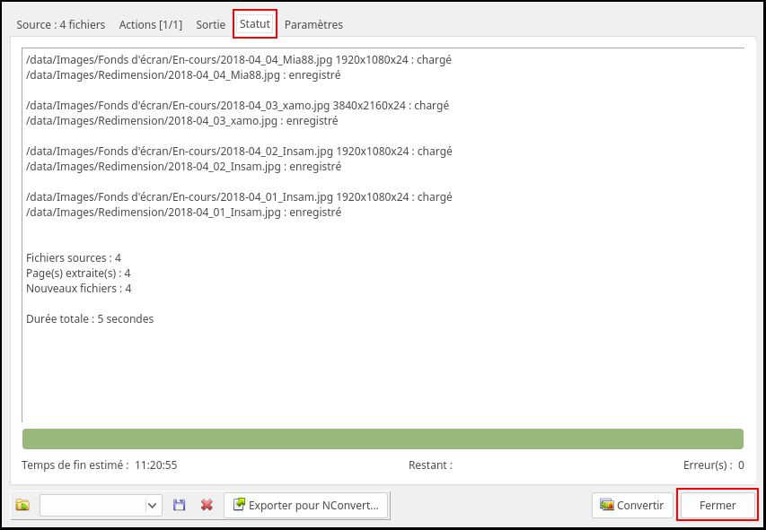 -soit envoyer vers un autre dossier (pour moi dossier ”Redimension”) ce qui préserve les originaux.