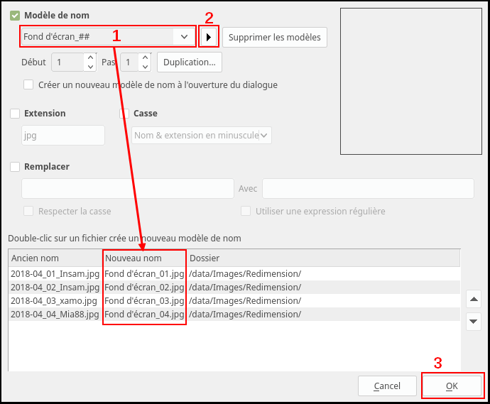 - (1)sélectionner le dossier contenant les photos à renommer,