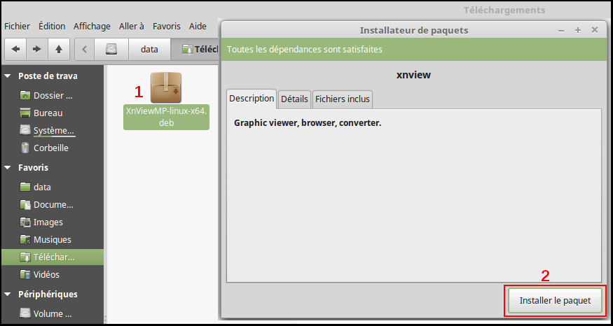- Choisir, dans la partie "télécharger", le paquet Debian 32 ou 64 bits en fonction de l'Os installé, télécharger, enregistrer, puis(1)double clic sur le fichier XnViewMP-linux-xXX.deb qui doit être dans "Téléchargements",(2)installer le paquet, la langue est détectée automatiquement, puis OK et voilà ça s'installe tout seul. Une fois installé (et essayé), on peut supprimer le fichier .deb
