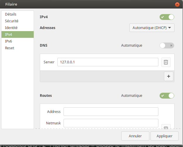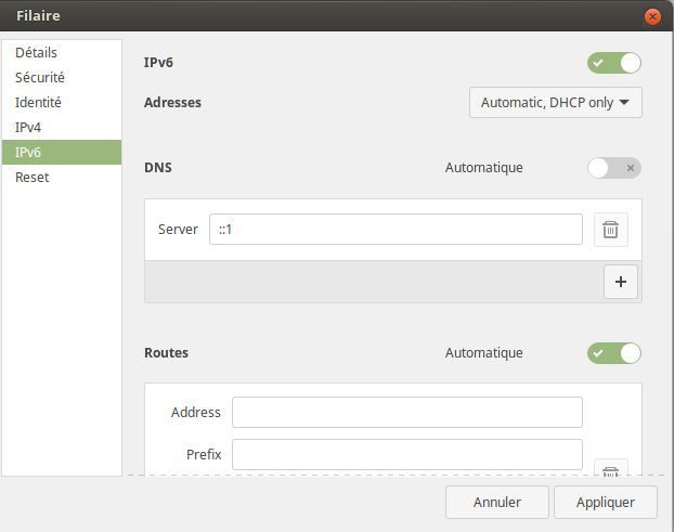 - dans votre gestionnaire de réseau - onglet Ipv4 et Ipv6