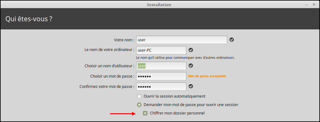 Si vous souhaitez chiffrer votre répertoire /home, il vous suffit de cocher la case correspondante lors du choix de votre nom d'utilisateur et de votre mot de passe.