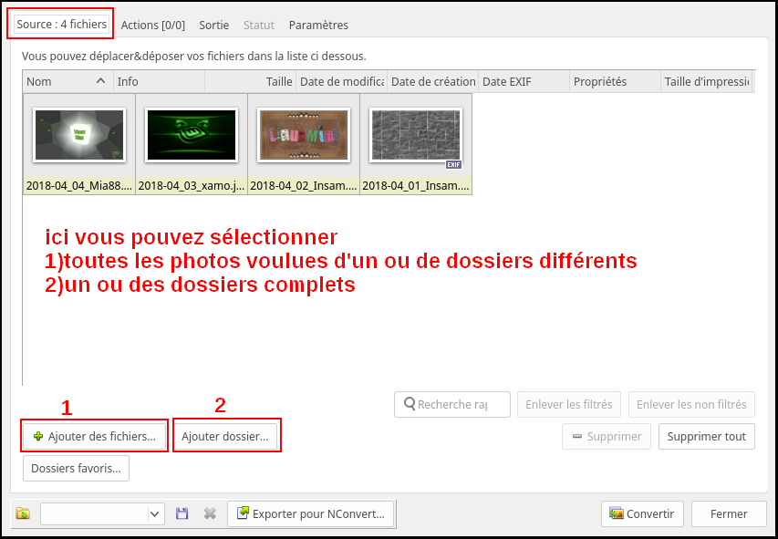 - Pour sélectionner les photos à redimensionner, provenant de dossiers différents ou non, ou sélectionner un ou des dossiers complets