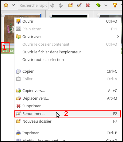 (4) renommer qu’une partie des images (qui doivent être cochées avant) (1) clic droit sur la sélection, (2) renommer, (1) entrer le nouveau nom (on voit de suite le changement en bas),(2) éventuellement, différentes options pour le nom nous sont proposées